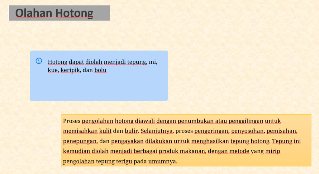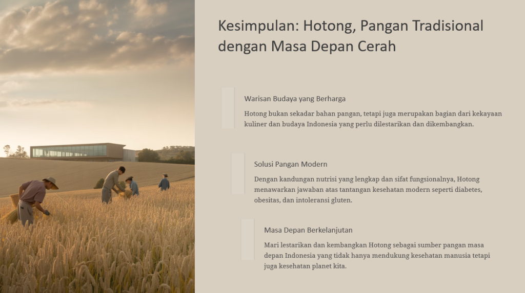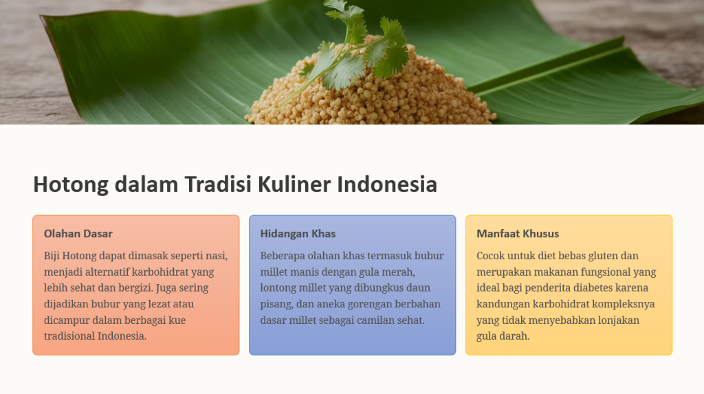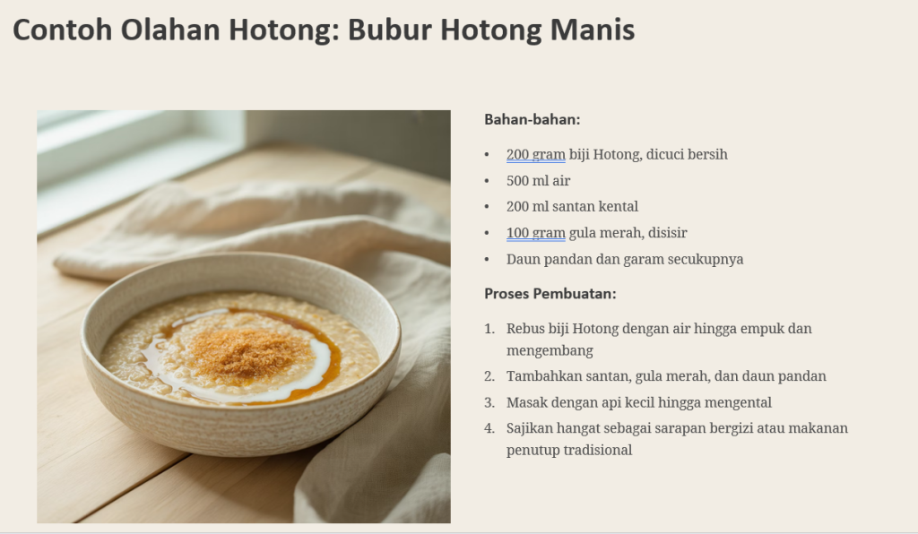 Tanaman Hotong memiliki kandungan nutrisi yang tinggi, hampir setara dengan beras, tetapi dengan kadar protein yang lebih besar